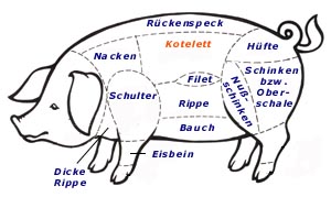 Das Kotelett gliedert sich in mehrere Bereiche. Der Vorderteil liefert die sogenannten Stielkoteletts